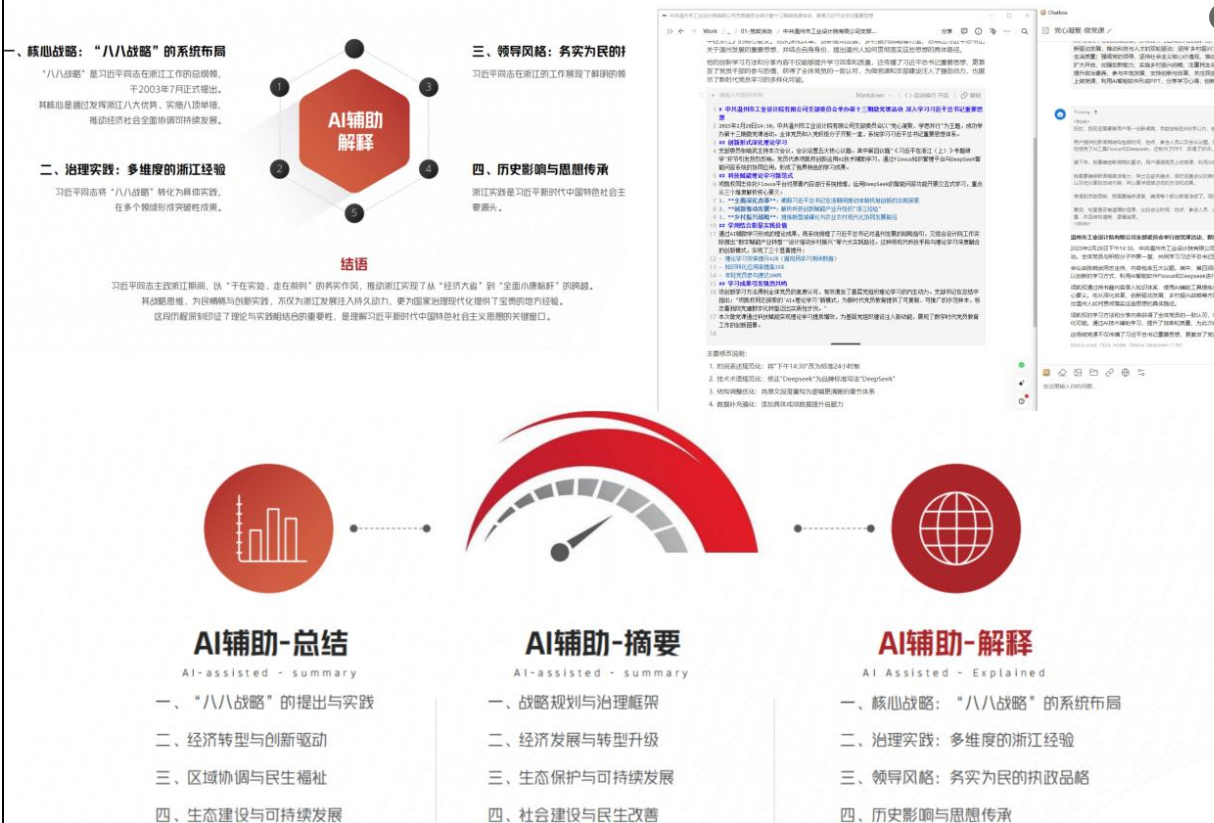 項(xiàng)凱權(quán)同志依托Flowus平臺(tái)對原著內(nèi)容進(jìn)行系統(tǒng)梳理了習(xí)近平總書記對浙江以及溫州發(fā)展的戰(zhàn)略指引,運(yùn)用DeepSeek的智能問答功能開展交互式學(xué)習(xí),重點(diǎn)從三個(gè)維度解析核心要義:一是全面深化改革,闡釋習(xí)近平總書記在浙江期間推動(dòng)體制機(jī)制創(chuàng)新的實(shí)踐探索;二是創(chuàng)新驅(qū)動(dòng)發(fā)展,解析科技創(chuàng)新賦能產(chǎn)業(yè)升級(jí)的"浙江經(jīng)驗(yàn)";三是鄉(xiāng)村振興戰(zhàn)略,提煉新型城鎮(zhèn)化與農(nóng)業(yè)農(nóng)村現(xiàn)代化協(xié)同發(fā)展路徑。