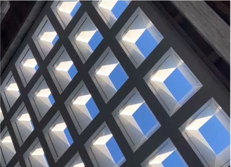 建筑美學(xué):建筑內(nèi)部空間流動(dòng)活潑,以多維度的層次感與流動(dòng)性喚醒豐富的空間體驗(yàn);建筑外立面采用橫向條形玻璃窗與啞光藍(lán)色鋁板交替構(gòu)成,形成簡(jiǎn)潔的現(xiàn)代韻律。同時(shí)中庭的空間構(gòu)架在光影交織中勾勒出虛實(shí)交錯(cuò)的幾何敘事。